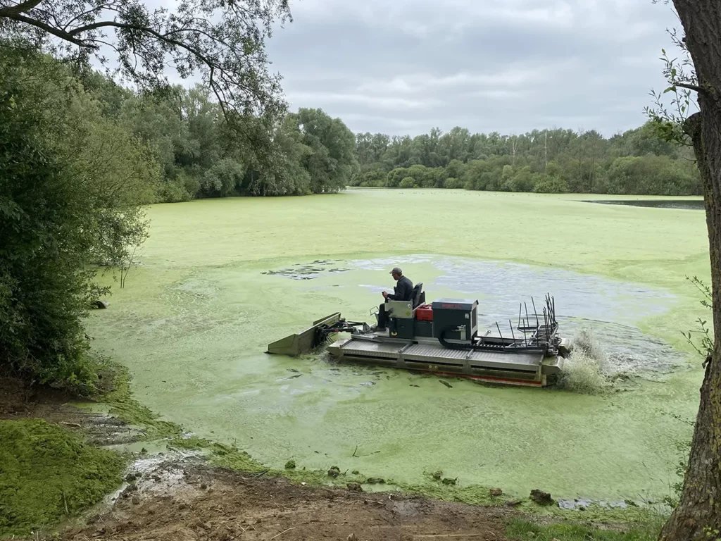 Nous réalisons le faucardage des cours d’eau et zones humides afin de maîtriser la prolifération de la végétation aquatique tout en préservant l’équilibre naturel.
