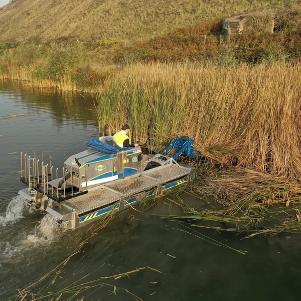 • Bateaux faucardeurs équipés de lames de coupe ou de paniers et ou godets frontaux pour sectionner la végétation sous-marine.
